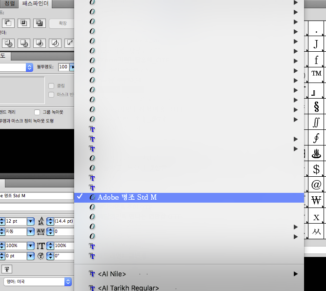 preferences/Type/show font name in English를 체크하시고 한번 해보세요 업데이트후 서체 충돌은 요걸로 해결한적이 있어서요